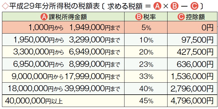課税所得金額に所得税の税率を適用し、所得税額を算出します。所得税額は、「平成29年分所得税の税額表」で求めます。