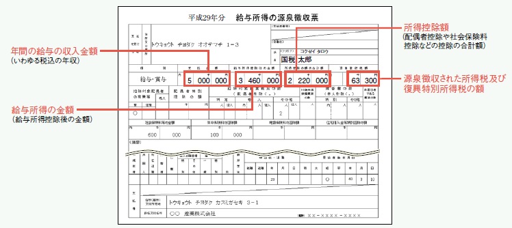 国税庁ホームページより国税太郎さんを例にとって、勤務先から次の「給与所得の源泉徴収票」の交付を受けたものとして所得税及び復興特別所得税の額の計算方法を確認します。