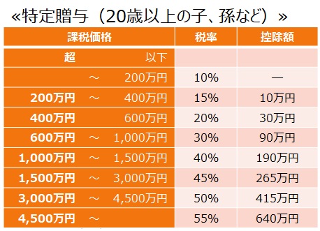 「特例贈与」の贈与税率は以下の通りです。