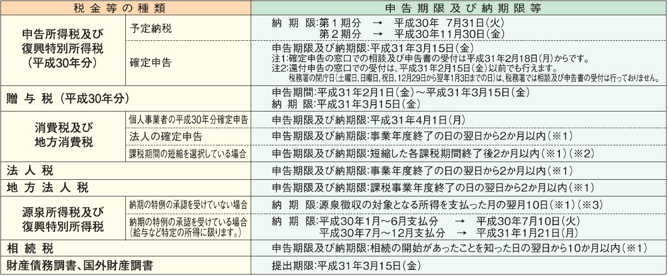 - 申告期限・納期限が、土曜日、日曜日、祝日等の場合は、その翌日が期限となります。
